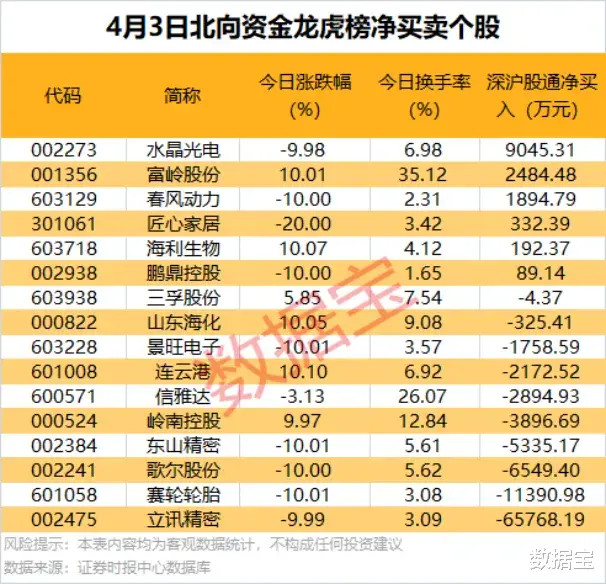 北向资金现身16只股龙虎榜,水晶光电、富岭股份、春风动力获净买入超千万元,立讯精密、赛轮轮胎均遭北向资金净卖出超亿元。