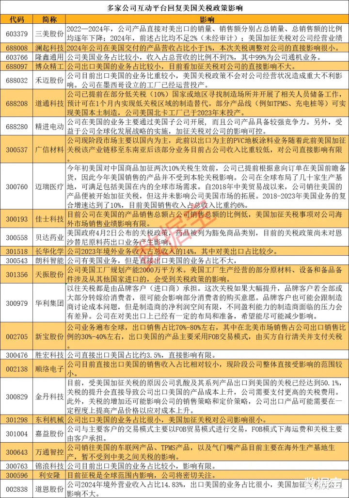 统计显示,20多家公司在交易所互动平台上回复美国关税政策对公司的影响。有公司表示,目前征税是全球范围内的,将密切关注,也有公司表示在海外建立生产基地或对美国出口占比较小。