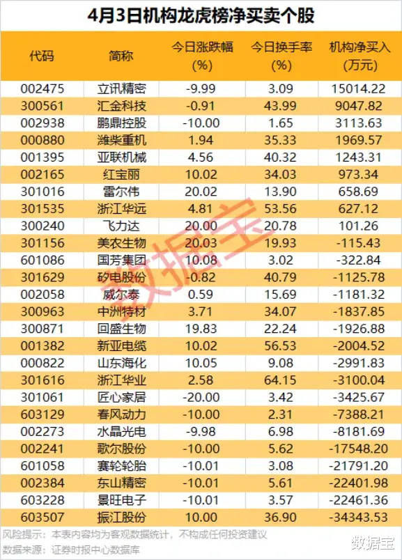 4月3日龙虎榜中,共5股获机构净买入超千万元,立讯精密跌停,机构净买入1.5亿元,净买入居首。机构净卖出个股中,振江股份、景旺电子、东山精密、赛轮轮胎、歌尔股份等5股均遭净卖出超亿元。