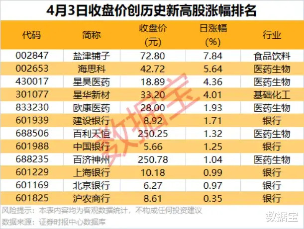 收盘创历史新高股中,今日股价平均上涨2.62%,涨幅居前的有盐津铺子、海思科、星昊医药等。